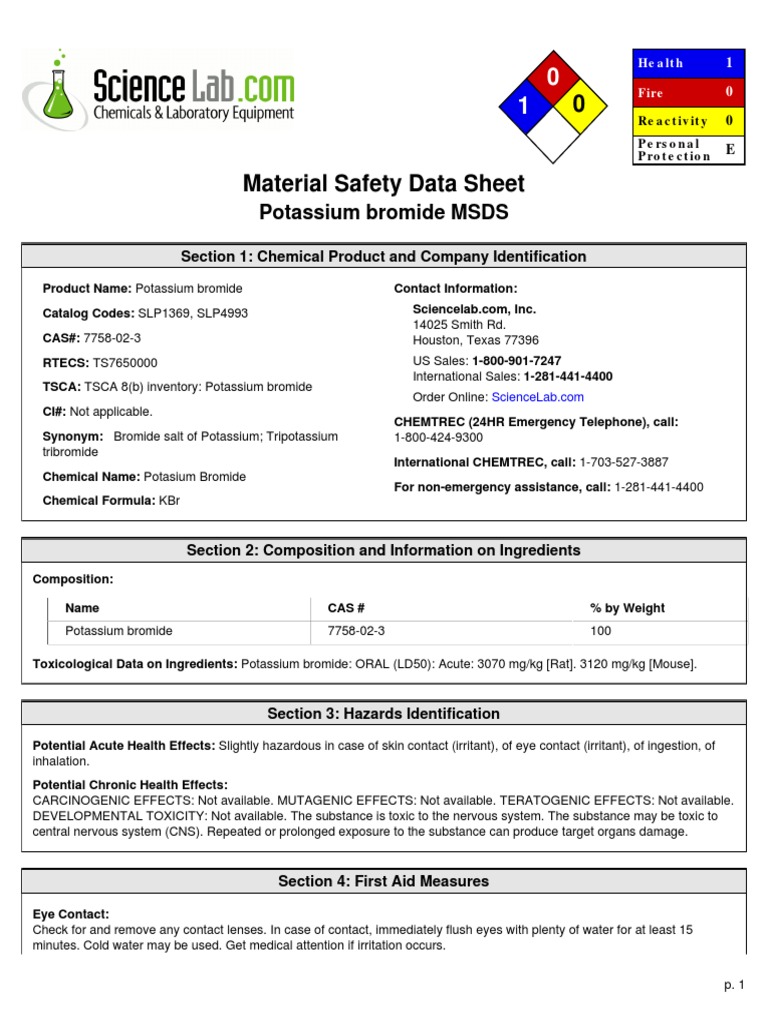 Material Safety Data Sheet Potassium bromide MSDS PDF Toxicity Water