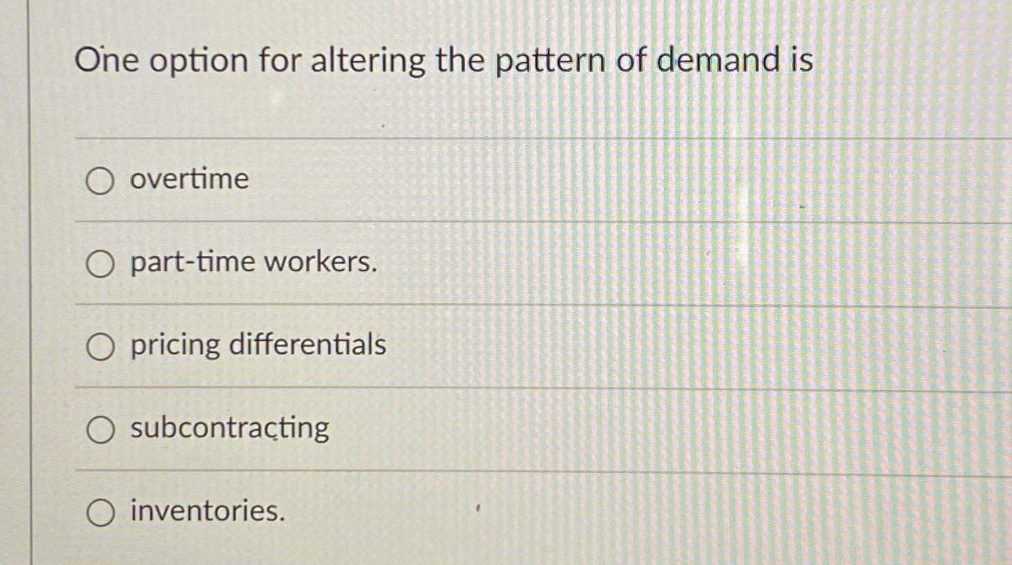 One option for altering the pattern of demand is: One option for altering the pattern of demand is: A) hiring employees b) using overtime c) carrying inventory d) subcontracting e) pricing Pricing', and understand that pricing is a crucial factor in influencing the pattern of demand for a product or service. One option for altering the pattern of demand is: