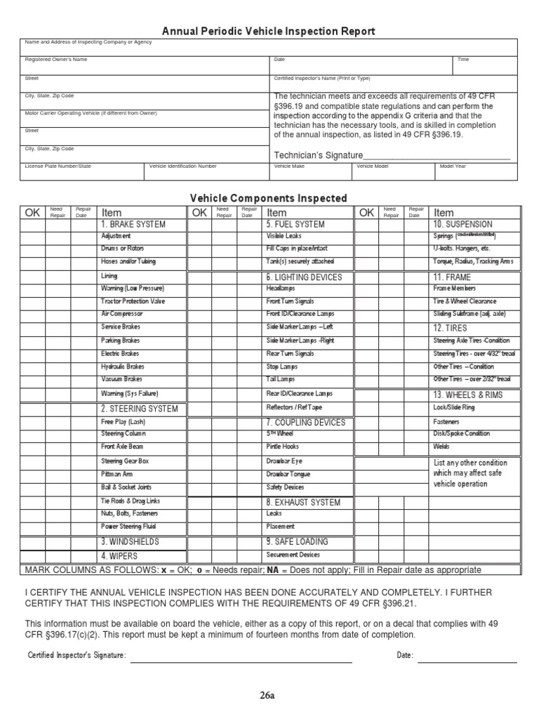Vehicle inspection, repair, and maintenance record. This vehicle has passed all the. Certify the annual vehicle inspection has. By law, all cdl vehicles are required to have a pre. Motor carrier operator inspector's name (print or.