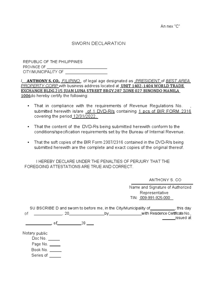Sworn Declaration Bir Annex A1 Download Fill Online, Printable