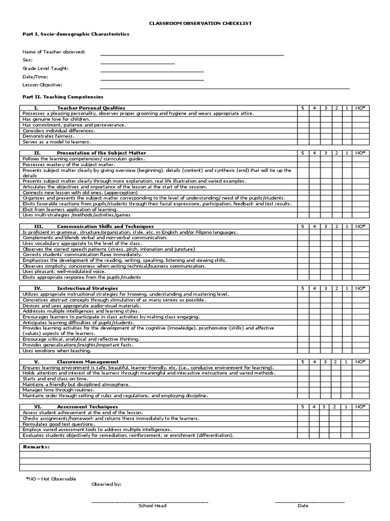Classroom Observation Checklist PDF Educational Assessment Learning